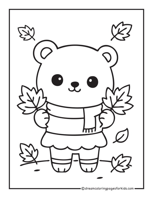 Adorable kawaii bear wearing a cozy scarf and holding autumn leaves in both hands. Surrounded by falling leaves with simple thick outlines and a clean minimal background—perfect for kids, beginners, and fun printable coloring activities.
