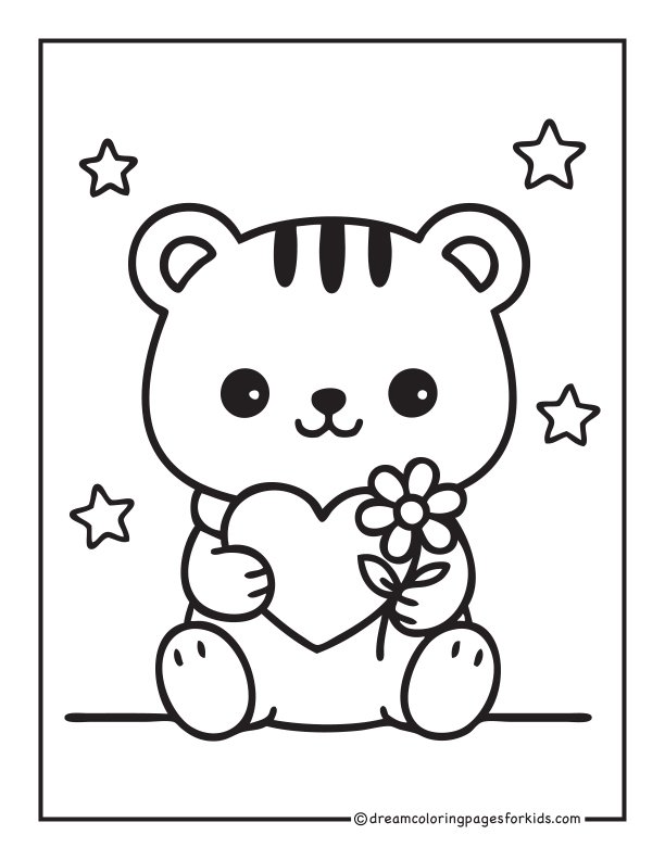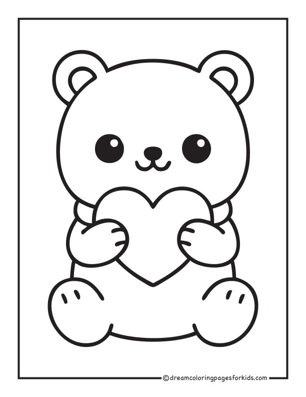 Adorable kawaii bear hugging a big heart with both paws, smiling sweetly. Features rounded shapes, simple thick outlines, and a clean minimal background—perfect for kids, beginners, and fun printable coloring activities.