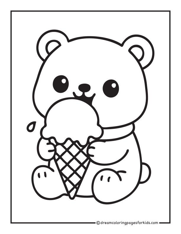 Adorable kawaii bear happily eating a giant ice cream cone with little drips falling. Features big shiny eyes, rounded shapes, and simple thick outlines—perfect for kids, beginners, and fun printable coloring activities.