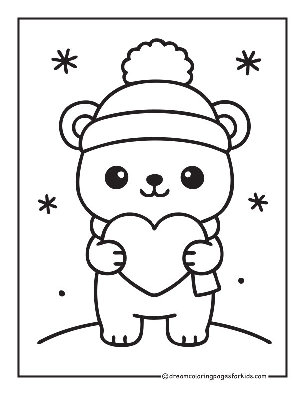 Adorable kawaii bear wearing a fluffy winter hat with a pom-pom, standing on a snowy hill with tiny snowflakes. Features rounded shapes and simple thick outlines—perfect for kids, beginners, and fun printable winter coloring activities.