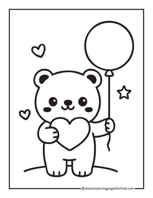 Adorable kawaii bear standing and holding a round balloon with a string, surrounded by tiny hearts and stars. Features simple thick outlines, rounded shapes, and a clean minimal background—perfect for kids, beginners, and fun printable coloring activities.