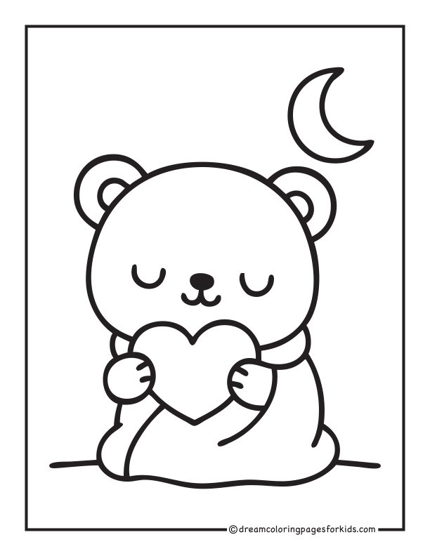Adorable sleepy kawaii bear wrapped in a cozy blanket with a tiny moon above. Features gentle closed eyes, rounded shapes, and simple thick outlines—perfect for kids, beginners, and relaxing printable coloring activities.