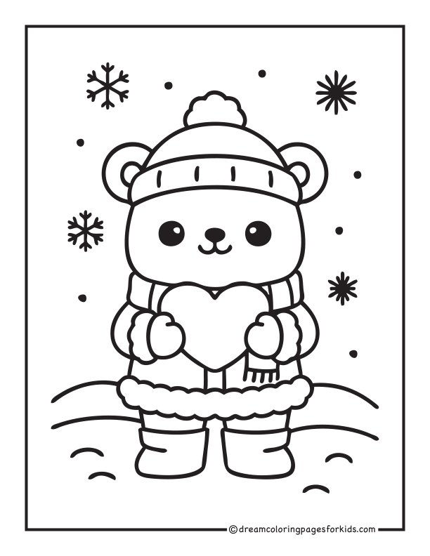 Adorable kawaii bear dressed in a warm winter coat, scarf, mittens, and boots, happily playing in falling snow. Surrounded by snowflakes and simple snowy hills, with thick outlines and a clean minimal background—perfect for kids, beginners, and fun winter-themed coloring activities.