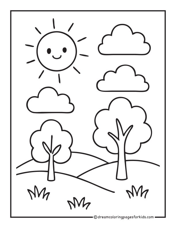 A happy smiling sun shining over rolling hills, fluffy clouds, and simple kawaii-style trees. Clean thick outlines and minimal details make this an easy and relaxing coloring page for kids.