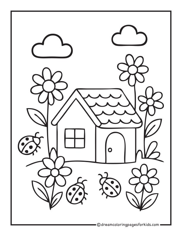 A sweet little kawaii house surrounded by tall flowers, leafy plants, and happy ladybugs. Simple thick outlines and a clean vector style make this an easy and fun coloring page for kids.