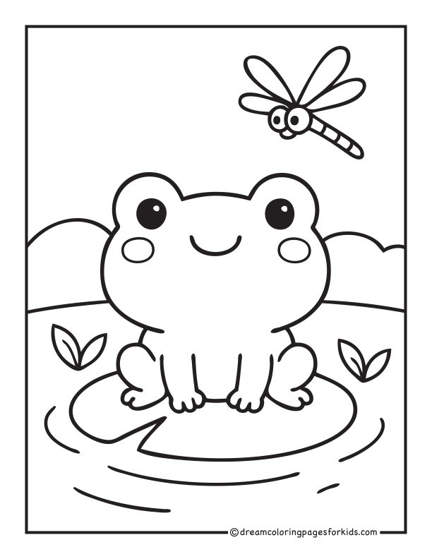 A happy kawaii frog sitting on a lily pad with a friendly dragonfly above. Simple thick outlines, minimal background, and clean vector style make it an easy and fun coloring page for kids.