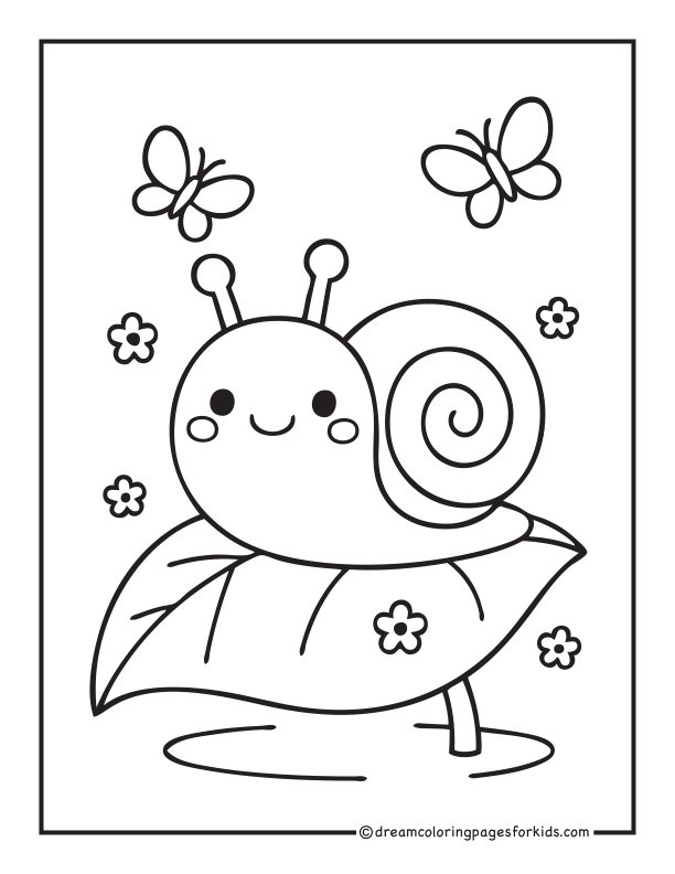 A happy kawaii snail sitting on a big leaf, surrounded by tiny flowers and butterflies. Simple thick outlines and a clean vector style make this an easy and fun coloring page for kids.