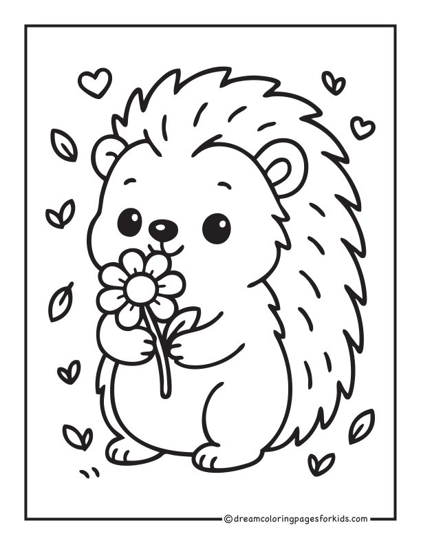 An adorable kawaii hedgehog holding a daisy, surrounded by tiny leaves and hearts. Simple thick outlines and a clean vector style make it a fun and easy coloring page for kids.