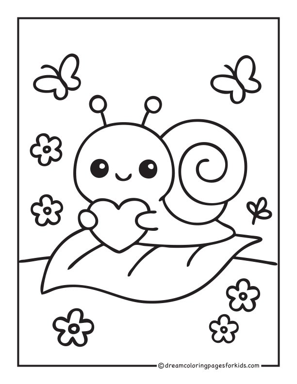 A sweet kawaii snail sitting on a leaf and holding a heart, surrounded by butterflies and flowers. Simple thick outlines and a clean vector style make it an easy and fun coloring page for kids.