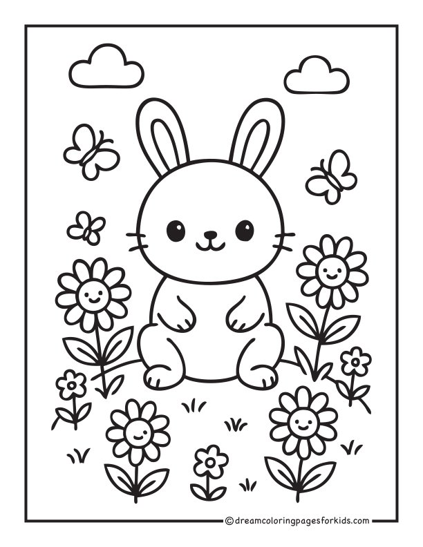 A happy kawaii bunny sitting in a garden full of smiling flowers and fluttering butterflies. Simple thick outlines and a clean vector style make this an easy and fun coloring page for kids.