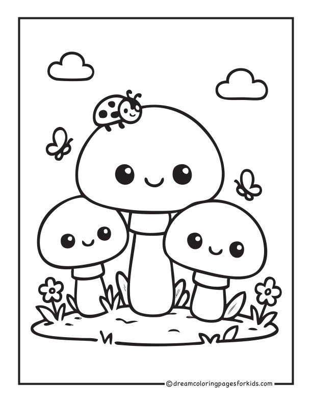 A cheerful trio of kawaii mushrooms with happy faces, surrounded by butterflies, flowers, and a friendly ladybug. Simple thick outlines and a clean vector style make this an easy and fun coloring page for kids.